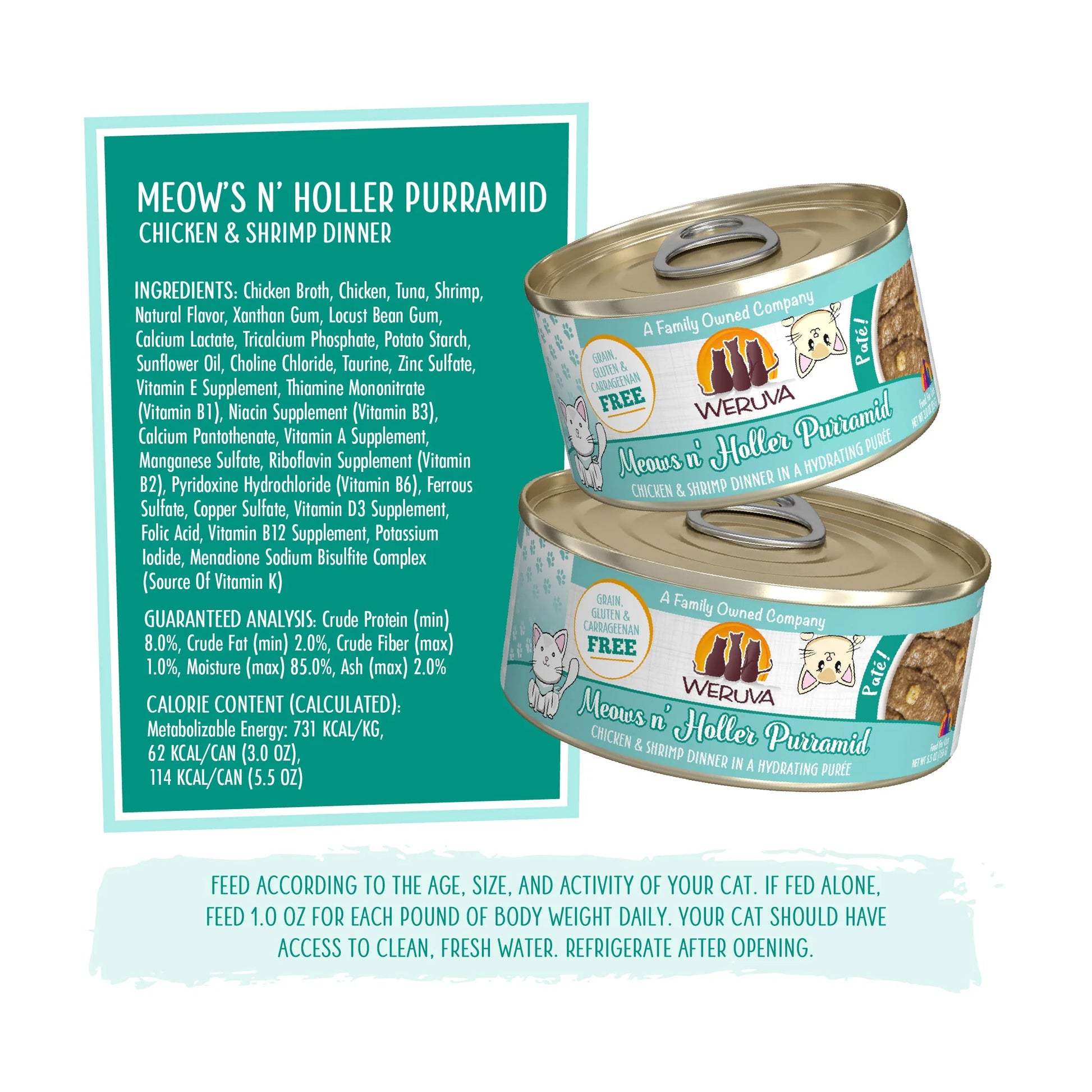 Weruva Pate Meows n' Holler Purramid Chicken & Shrimp dinner in a Hydrating Puree