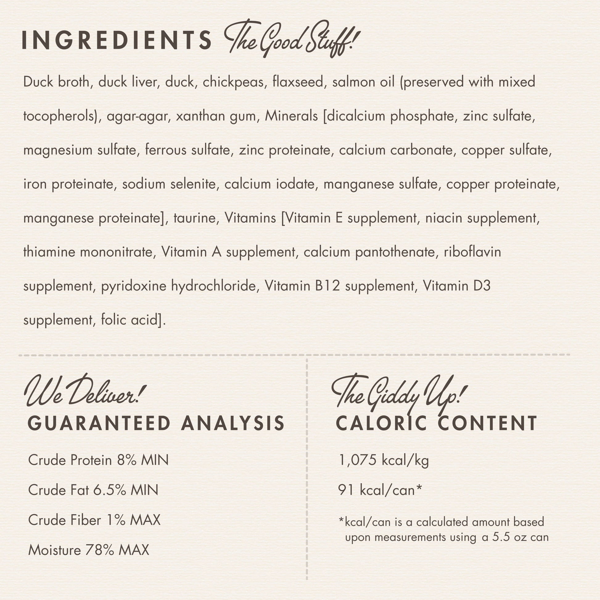 Duck Broth,Duck Liver,Duck,Chickpeas,Flaxseed,Salmon Oil (preserved with mixed tocopherols),Agar-Agar,Xanthan Gum, Minerals [Dicalcium Phosphate, Zinc Sulfate, Magnesium Sulfate, Ferrous Sulfate, Zinc Proteinate, Calcium Carbonate, Copper Sulfate, Iron Proteinate, Sodium Selenite, Calcium Iodate, Manganese Sulfate, Copper Proteinate, Manganese Proteinate], Taurine, Vitamins [Vitamin E Supplement, Niacin Supplement, Thiamine Mononitrate, Vitamin A Supplement, Calcium Pantothenate, Riboflavin Supplement, Pyridoxine Hydrochloride, Vitamin B12 Supplement, Vitamin D3 Supplement, Folic Acid].