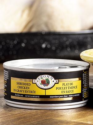 Fromm Four-Star Shredded Chicken in Gravy Entrée features a generous portion of shredded chicken cooked in chicken broth with sweet potatoes. The recipe is prepared to ensure consistency, quality, and superior taste. Shredded Chicken in Gravy Entrée is complete and balanced for all life stages.