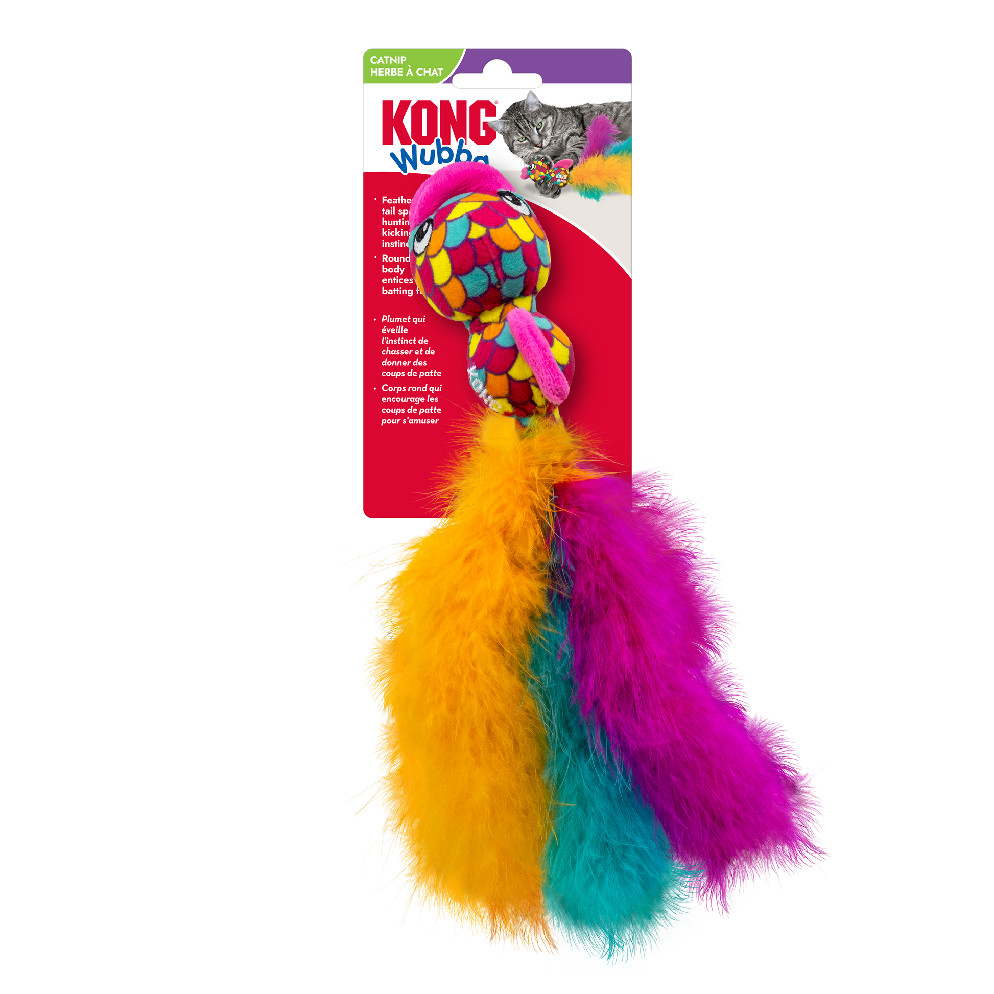 KONG Wubba™ Fish energizes cats’ playtime with KONG Premium North American Catnip, crackling material, and an inner rattling sound. Fluttery, feathery tails entice batting while the round body invites pounce-and-capture play.