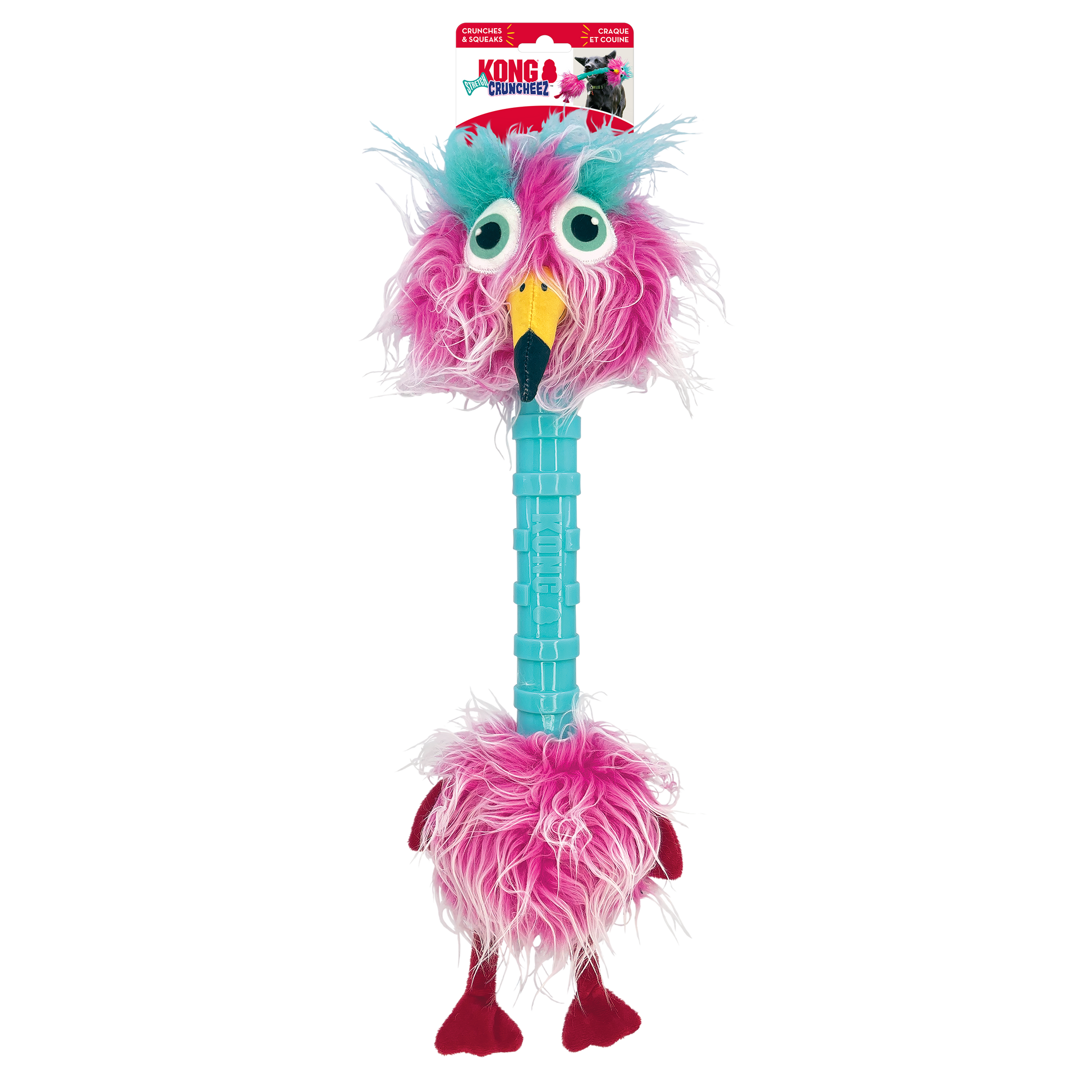 KONG Cruncheez Stretch Bird’s long neck squeaks irresistibly as dogs grab it, satisfying natural instincts with a whimsical bird buddy. This extra-long avian oddball’s floppy head and body make her even more fun to shake—and the crackly rattling body prolongs play.
