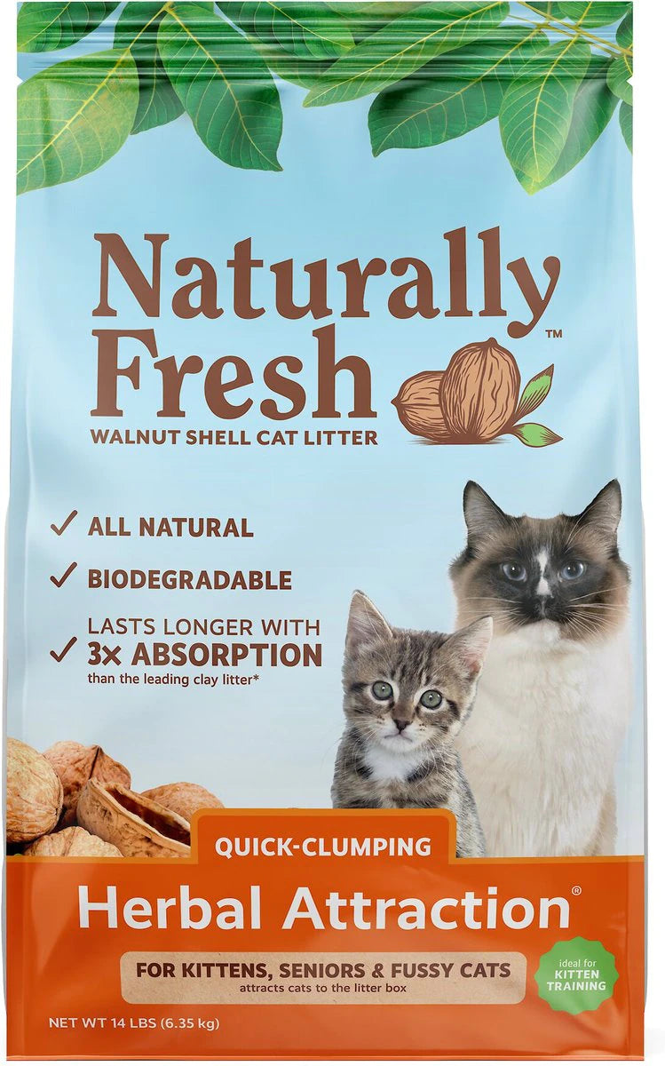 Persuade your kitty to do her business in the correct area with Naturally Fresh Walnut-Based Herbal Attraction Quick-Clumping Cat Litter. It features a blend of natural herbs that attracts cat companions of all ages to their litter box. Herbal Attraction is purr-fect for training kittens, senior sidekicks and fussy felines who have litter acceptance problems. Made from 100% natural walnut shells, this litter organically neutralizes odors better than clay, pine, corn and wheat. Plus, it’s plant-based, sustainably grown, solar produced, biodegradable, annually renewable and non-GMO! And since it’s free of clay-based silica dust, it’s a healthier litter alternative for pets and pet parents alike. You can also have peace of mind knowing that this Naturally Fresh litter is formulated without chemicals, toxins, clay, corn or grains for the safety of your furry friend.