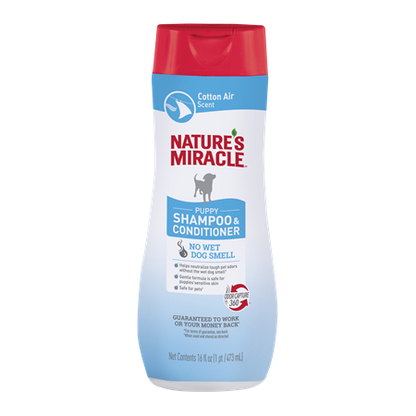 When strong dog odors start to crinkle your nose, it’s time for Nature’s Miracle™ Puppy Shampoo! The reformulated shampoo helps neutralize odors and freshens with a light cotton breeze scent, without the wet dog smell. Plus, the gentle formula is safe for puppies’ sensitive skin. Containing keratin and aloe vera, this shampoo provides the ultimate grooming experience.