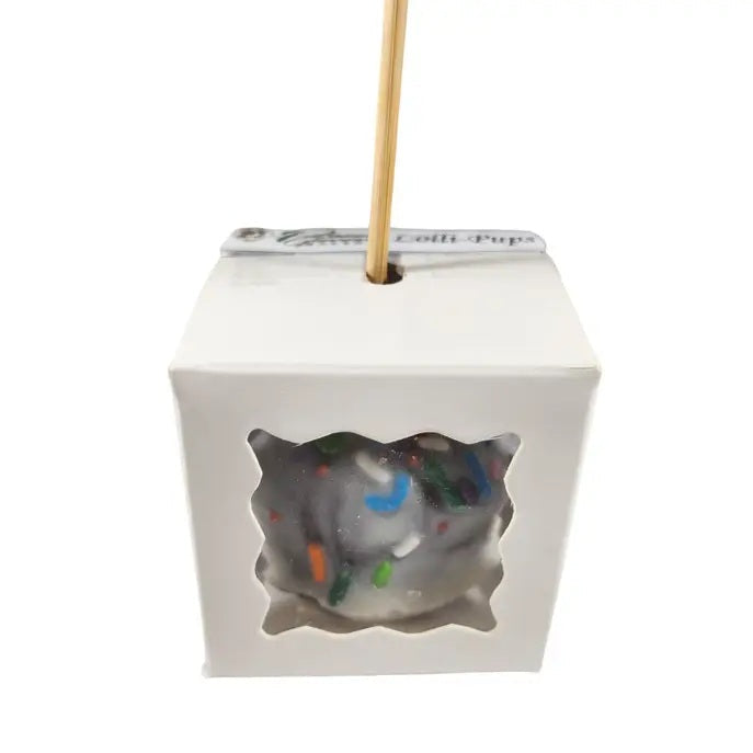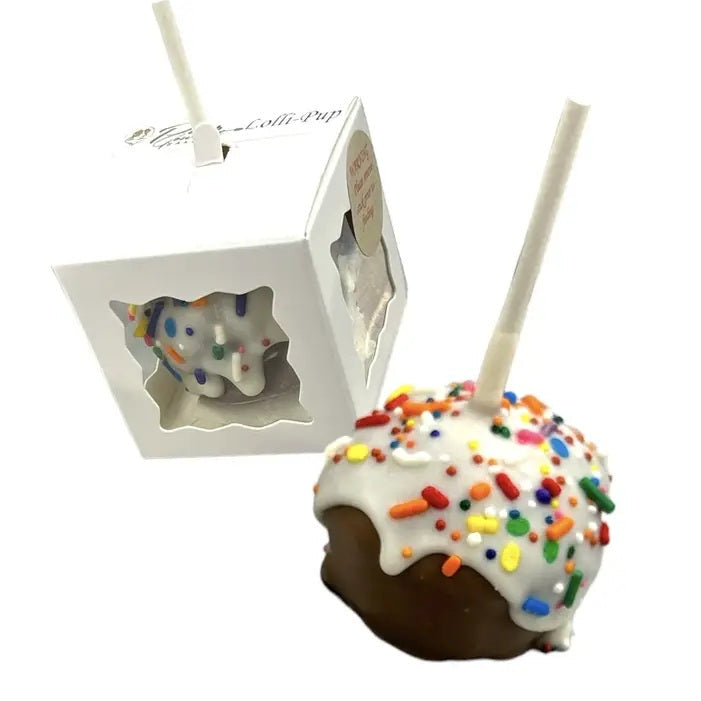 These Lolli-Pups come in a 2" white bakery box and are made with our banana cake recipe. Each one is completely dunked in our yogurt coating, jazzed up with some festive sprinkles, and placed on a stick (completely made of paper). {Please Note: While the paper stick is non-toxic and made of paper, please remove the stick before rewarding your pup to prevent any potential choking hazard. Do not refrigerate. Freezing can extend shelf life. Cake ingredients: Ground oats, banana puree, oat flour, rye flour, honey, rice flour, coconut oil, eggs, molasses, cinnamon, vanilla, baking soda, rosemary extract, sugar, palm kernel and palm oil, natural flavor, sunflower lecithin, salt, carob powder, turmeric, fruit and vegetable juice for color. Guaranteed analysis: Crude Protein (min): 6.2% Crude Fiber (max): 1.0% Crude Fat (min): 21.2% Moisture (max): 10.5% Calorie Content (ME Calculated): 4120 kcal/kg (28 kcal/Puppycake).