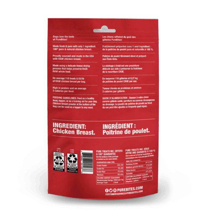 - Go ahead, look at our ingredients; made with only 1 simple human grade ingredient: 100% pure chicken breast; proudly sourced and freeze dried RAW in the USA; a great high-value treat, topper, or training aid for your dog