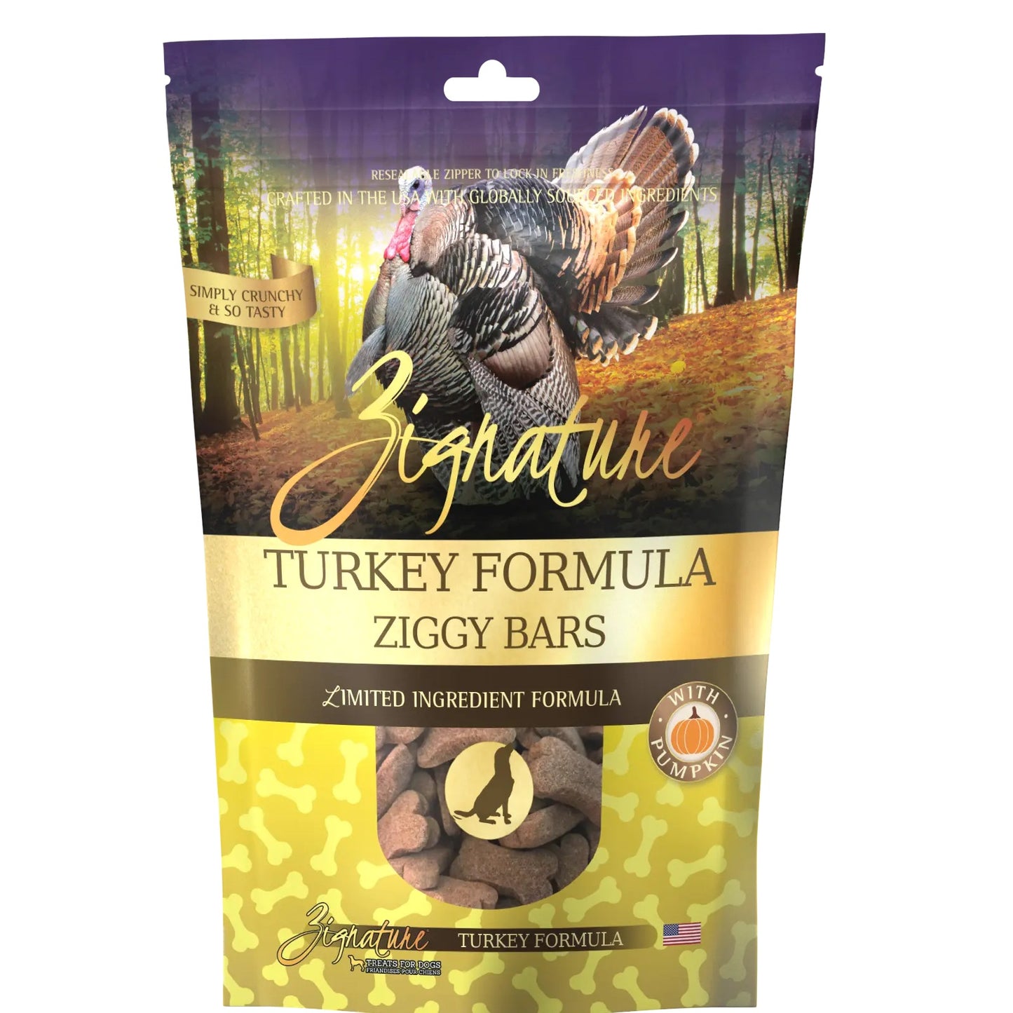 Zignature Turkey Ziggy Bars make training time more fun! These tasty treats are formulated with the same limited ingredient philosophy as our dry and canned foods and include healthy, wholesome ingredients like pumpkin to make treat time much more enjoyable for you and your furry friend!